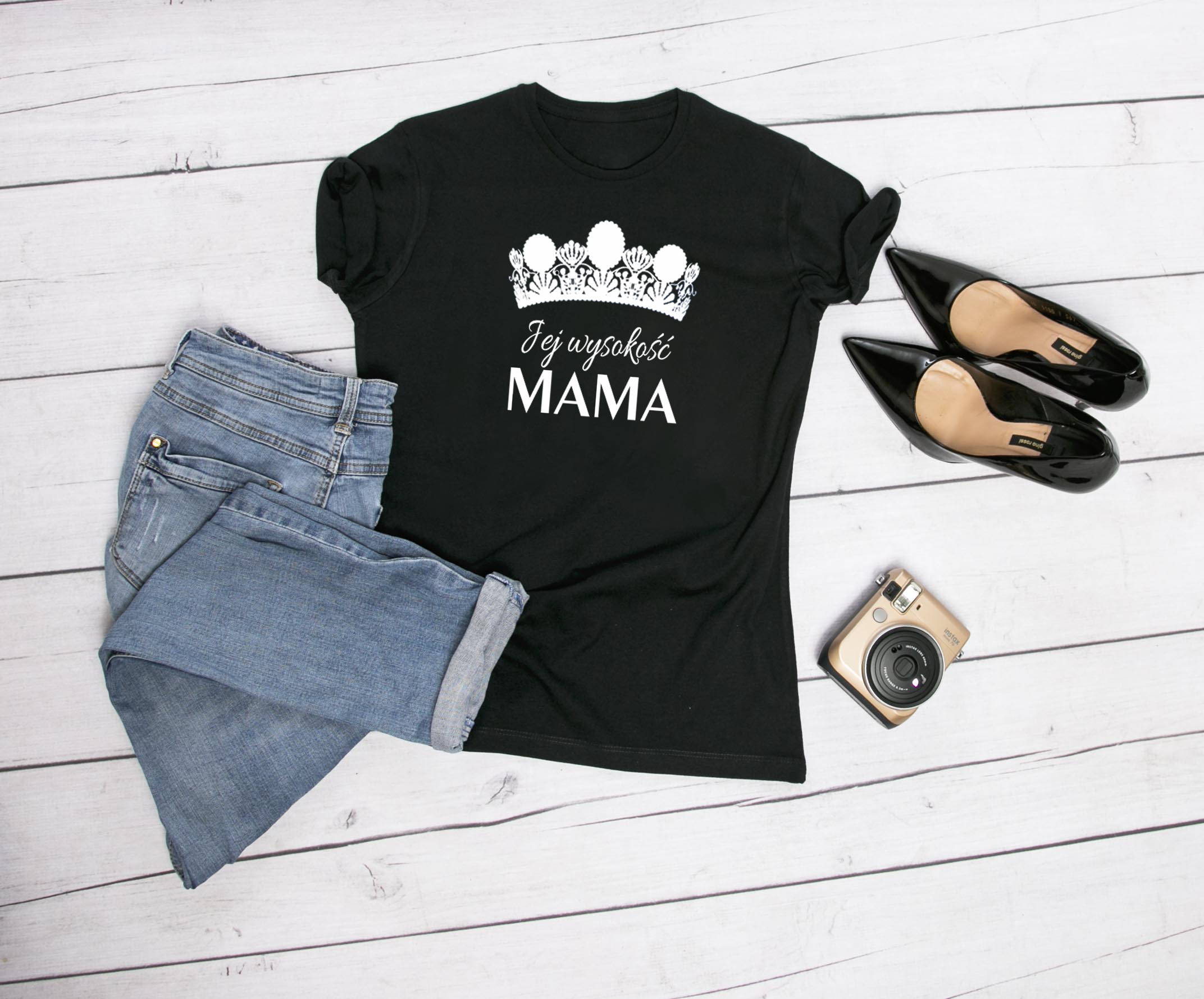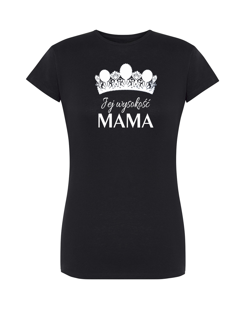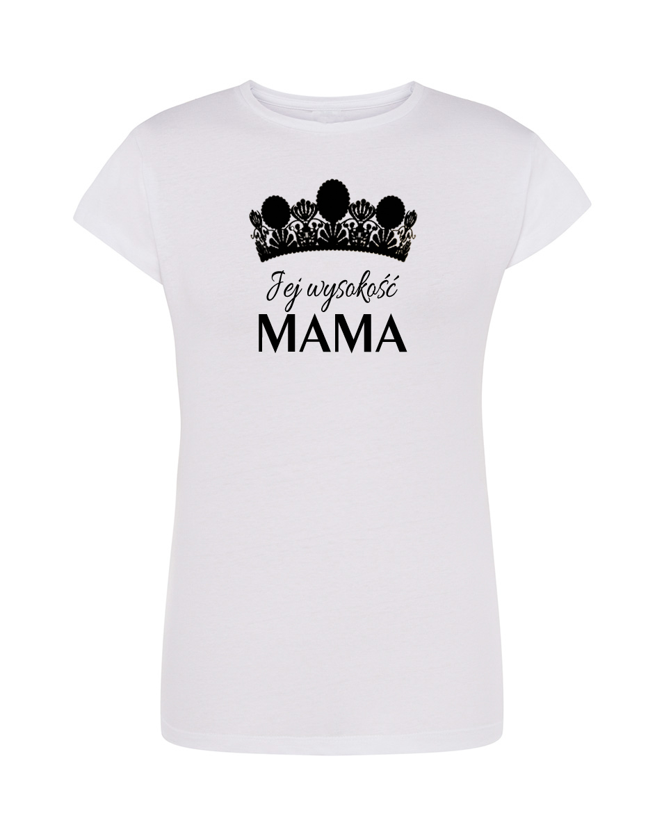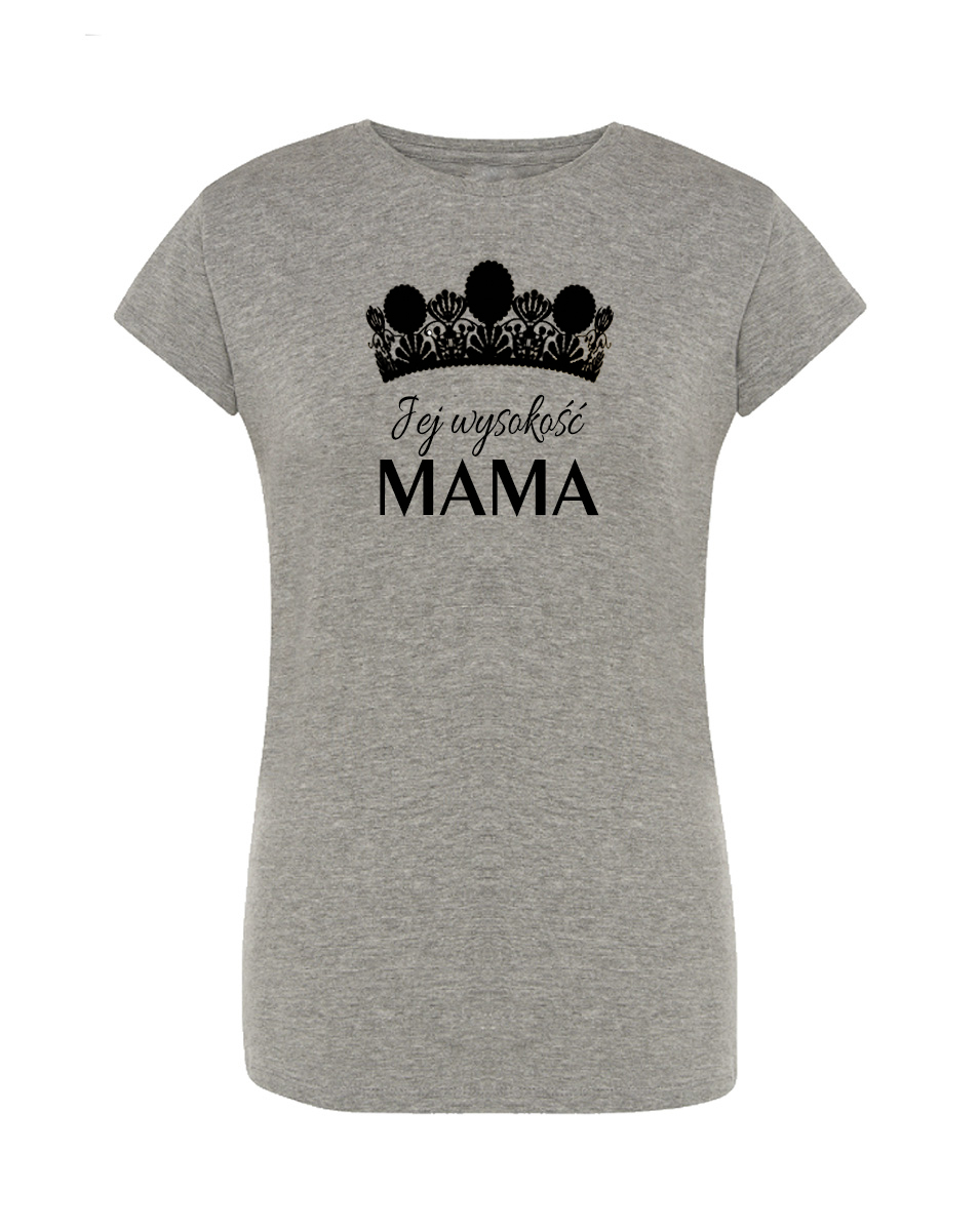 Koszulka Jej wysokość mama. Koszulka oraz nadruk wykonane w najwyższej jakości. Dostępna w 3 klasycznych kolorach: białym, szarym i czarnym. Idealna na prezent.