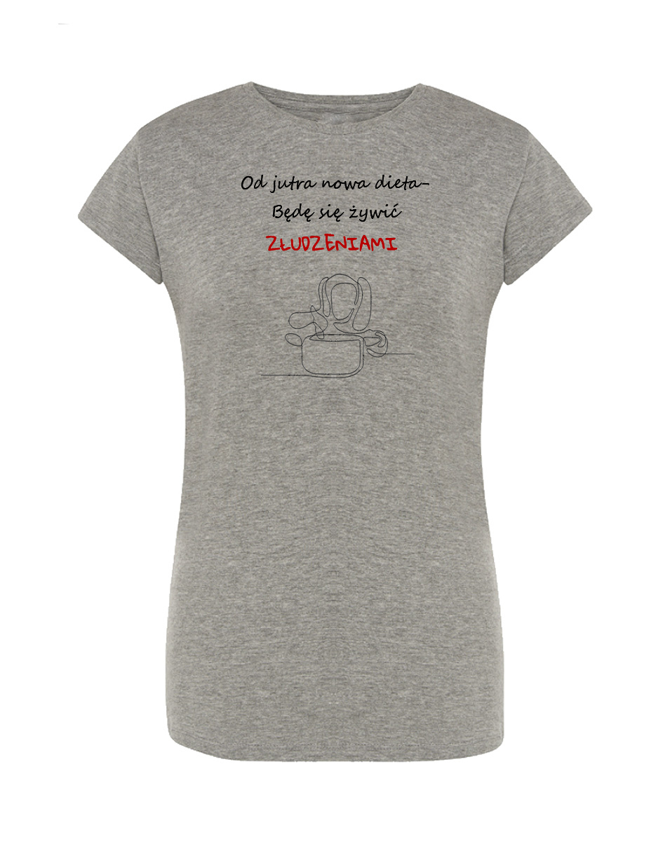 Koszulka nowa dieta. Koszulka oraz nadruk wykonane w najwyższej jakości. Dostępna w 3 klasycznych kolorach: białym, szarym i czarnym. Idealna na prezent. Spraw sobie damską koszulkę z napisem!