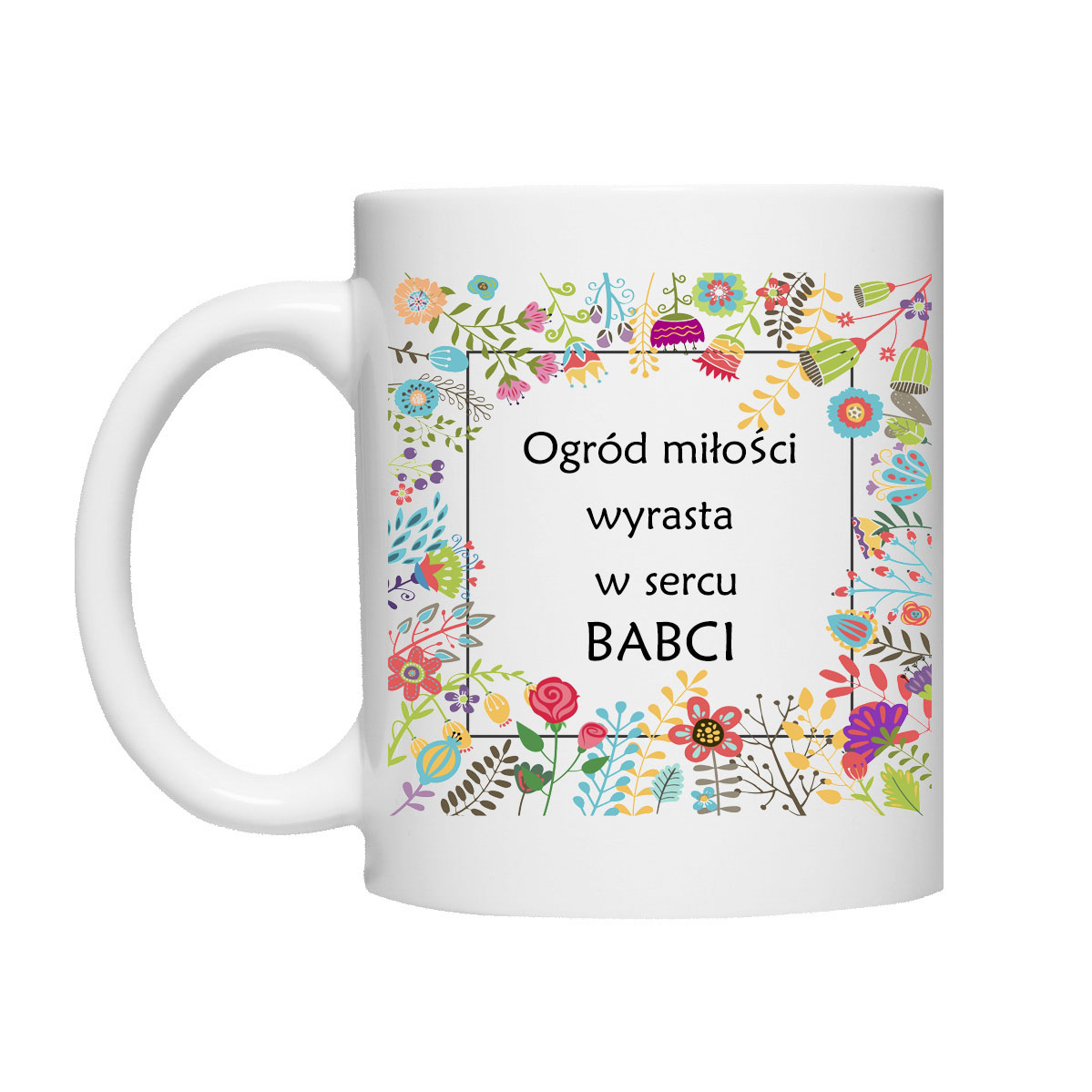 Kubek biały, ceramiczny drukowany metodą sublimacji.